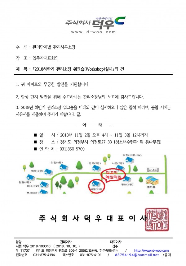 ■ 2018년 하반기 관리소장 워크숍(Workshop) 실시 ■ 페이지 정보 작성자 최고관리자 (115.♡.139.242) 작성일18-10-10 16:58 조회8,737회 댓글0건 관련링크 이전글 다음글 목록 본문 많은 참석 바랍니다...^^ 댓글목록 등록된 댓글이 없습니다. 이전글 다음글 목록